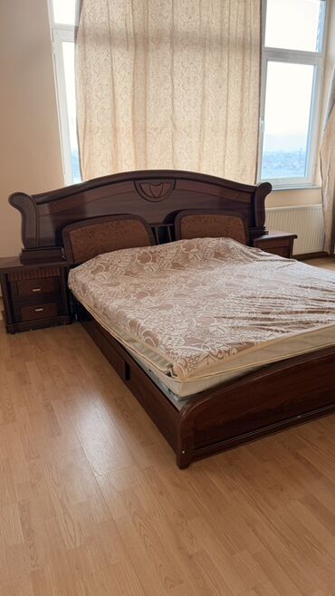 - Двуспальная кровать с высоким резным изголовьем и изножьем, мягкие спинки в изголовье, основание с нишей/ящиком снизу. Матрас на фото входит в комплект, верхний тонкий наматрасник.