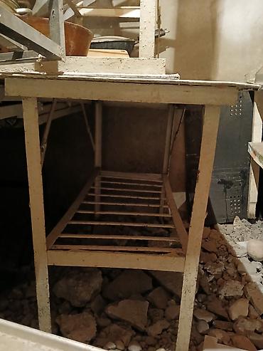 - Есть отдельный металлический стол-стойка с решётчатой полкой снизу: сварная конструкция, рабочая поверхность сверху, жёсткие опоры.