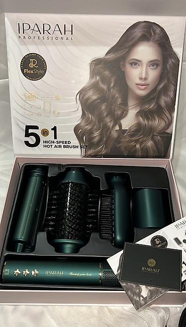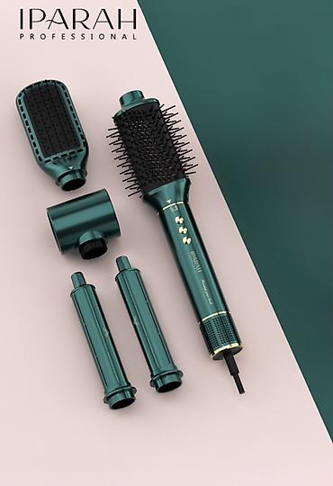 Идеален для ежедневной укладки и создания салонного результата дома. Цвет — изумрудный металлик с золотистыми элементами. На коробке: “5 in 1 High-Speed Hot Air Brush Set”. Бренд: IPARAH Professional.