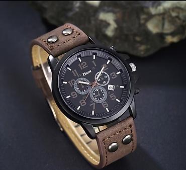 - Наручные часы с темным циферблатом и коричневым ремешком из эко‑кожи. Длина с ремешком 26 см. Аналоговый циферблат с отметками и декоративными субциферблатами.