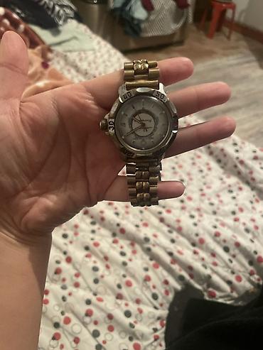 - Мужские/унисекс часы с белым циферблатом и металлическим браслетом; на циферблате надпись Quartz.