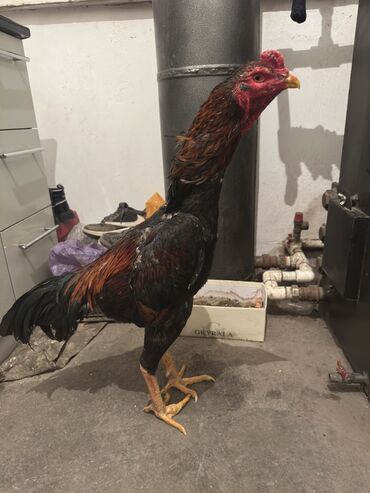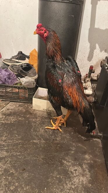 Окрас: черно-рыжий, плотное оперение, выраженный гребень, мощные ноги желтого цвета. Длинная шея, крепкий корпус, хорошая осанка. Возраст по внешнему виду — молодой половозрелый. Активный, подвижный, уверенный характер.