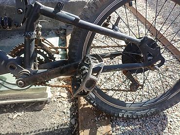 Велосипед с прочной металлической рамой черного цвета, предназначенный для использования в различных условиях. Оснащен передним амортизатором и дисковыми тормозами, обеспечивающими комфорт и безопа...