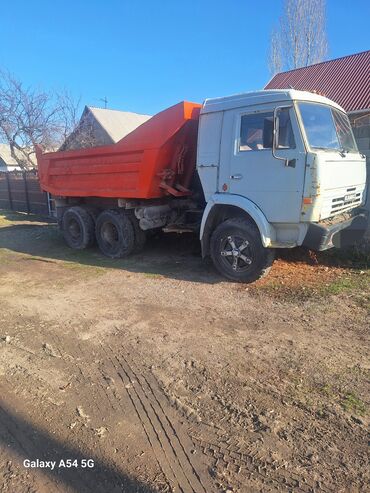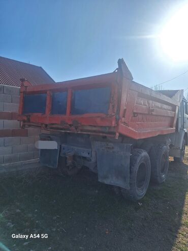 Самосвал с оранжевым кузовом, предназначенный для перевозки сыпучих материалов. Оснащен двойными задними колесами для улучшения устойчивости и грузоподъемности. Задние фонари и брызговики обеспечив...