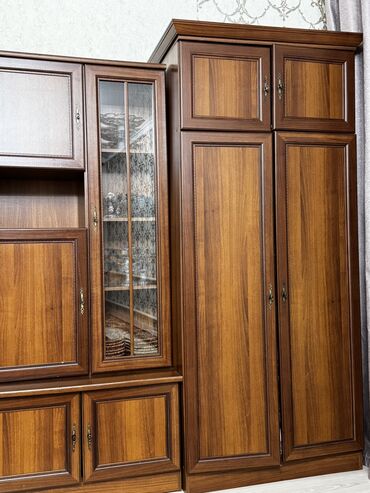 Гостиная стенка/модульный шкаф с витринами и местом под ТВ. В хорошем состоянии. Хочу интерьер поменять. - Компоновка: два высоких шкафа-витрины по бокам, центральный модуль с нишей под телевизор...