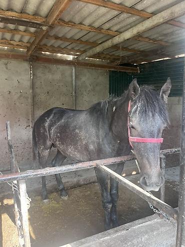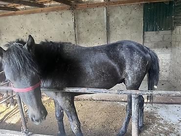Лошадь, масть темно-серая (в яблоках), в недоуздке. Крепкий корпус, выраженная мускулатура, правильные конечности. Спокойный темперамент по фотографиям: стоит на привязи, уверенно держится в станке. Подходит для упряжи и хозяйственных работ, а также как перспективный верховой вариант после дальнейшей выездки.