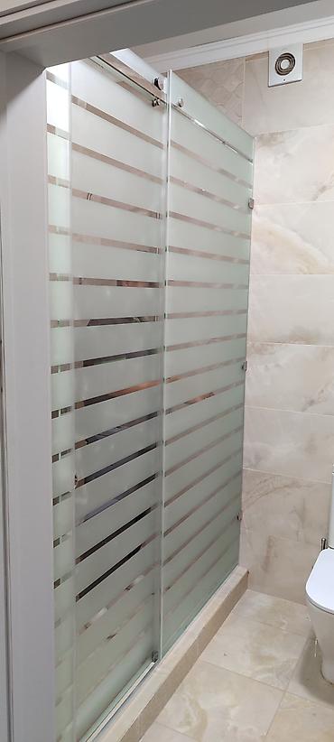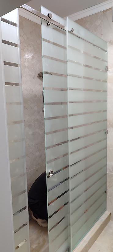 - Материал: закалённое стекло высокой прочности с матовыми полосами и прозрачными горизонтальными вставками для сочетания приватности и светопроницаемости.