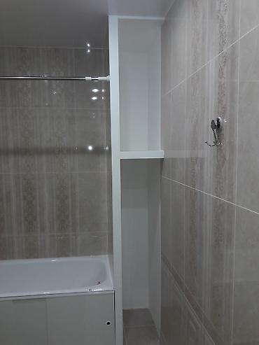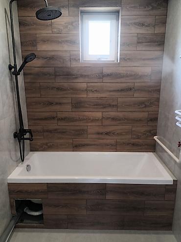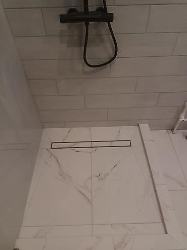- Ванные комнаты и санузлы: укладка керамической плитки и керамогранита, монтаж душевых зон с линейным трапом, установка ванн, экранов и смесителей, герметизация, разводка и подключение сантехники.