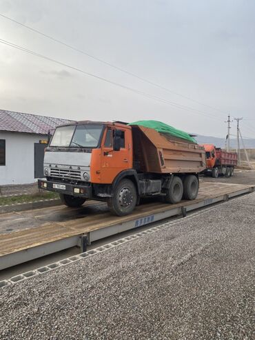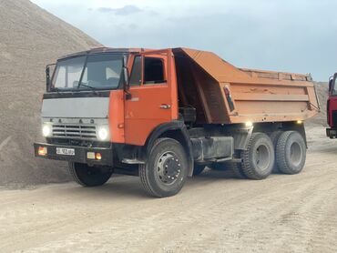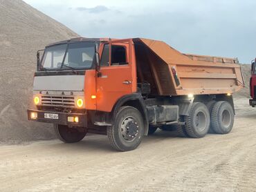 КамАЗ самосвал, трехосный (6x4), бортовой кузов с гидроподъемом. Основные характеристики: - Марка: КамАЗ (кабина старого образца). - Колесная формула: 6x4, задняя тележка двускатная. - Тип кузова:...