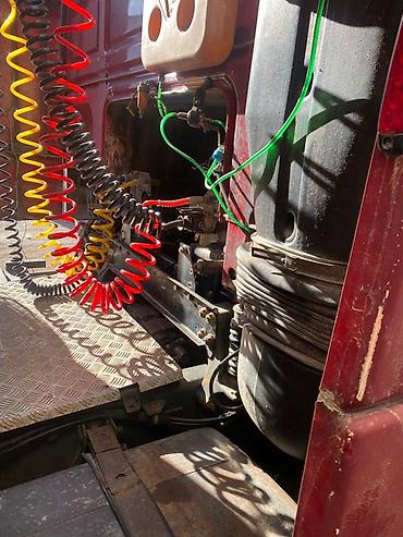 - Пневмосистема прицепа: спиральные шланги (красный/желтый) и электрический разъем установлены