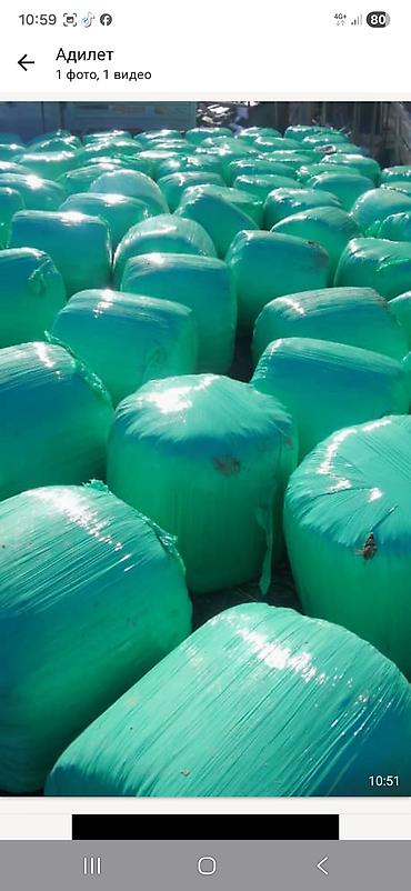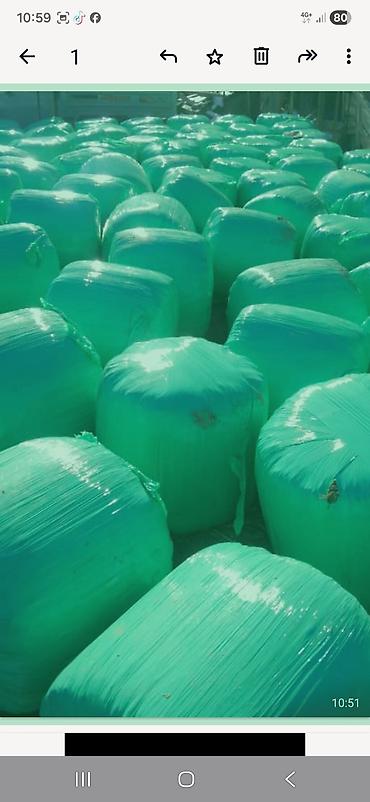 - Кормовые рулоны герметично упакованы в зеленую стрейч‑пленку для надежного силосования и сохранения питательности.