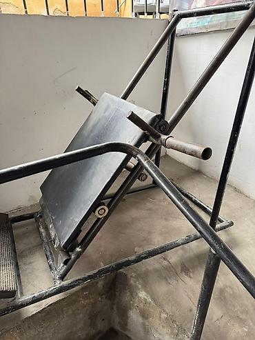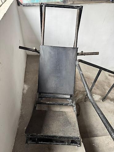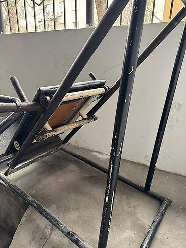 - Конструкция: массивная сварная рама из стальных труб, наклонная спинка с жёсткой подушкой, широкая рифлёная платформа для упора ног.
