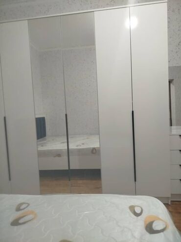 - Большой платяной шкаф: 5 створок, центральные секции с зеркалами во весь рост, длинные вертикальные ручки. Предусмотрены отделения для вешалок и полок (по ширине — формат семейного шкафа).