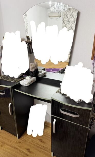 - Туалетный столик с большим арочным зеркалом: рабочая поверхность с закругленной кромкой, две боковые секции с дверцами и выдвижными ящичками, удобные металлические ручки.