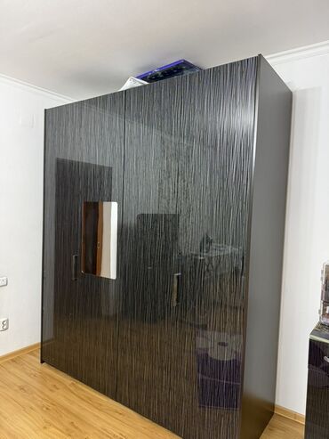 - Трехдверный шкаф-купе с глянцевыми фасадами: центральная вставка-зеркало, эргономичные ручки, вместительные отделения для одежды и белья.