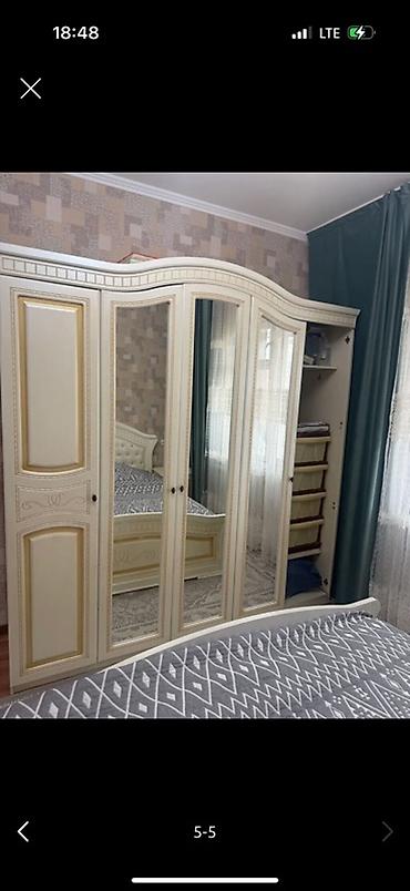 - Шкаф-купе/распашной на 5 секций с тремя зеркальными дверями; внутреннее наполнение включает полки, отделения для вешалок и выдвижные секции/органайзеры.