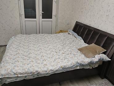 - Кровать двуспальная с мягким высокым изголовьем из велюра (панели-секции), каркас из ЛДСП/МДФ. Подходит под стандартный матрас king/queen (визуально около 160–180 см шириной). Ножки низкие, устойчивая конструкция.
