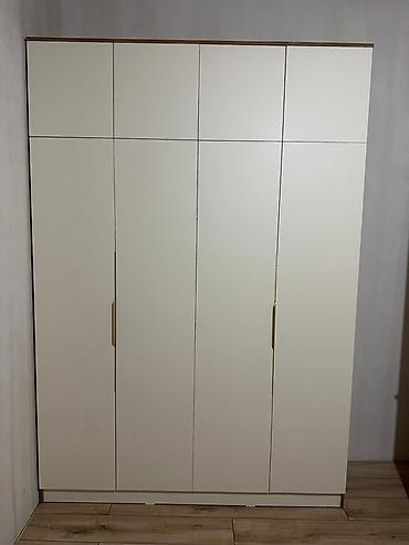 1) Четырёхдверный высокий шкаф со верхними антресолями, гладкие фасады, длинные вертикальные ручки.
