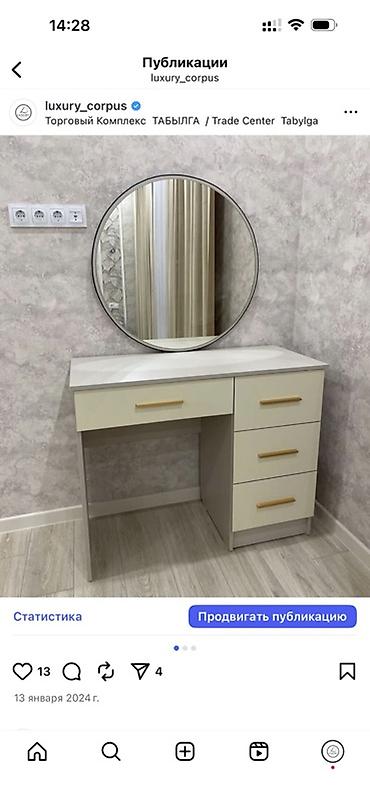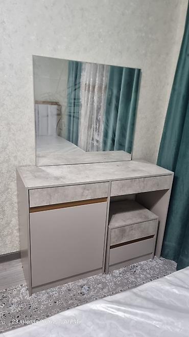 - Туалетный стол: широкая столешница под камень, большое прямоугольное зеркало; левая секция с распашной дверцей и верхним ящиком, справа ниша под пуф и тумба с двумя выдвижными ящиками.