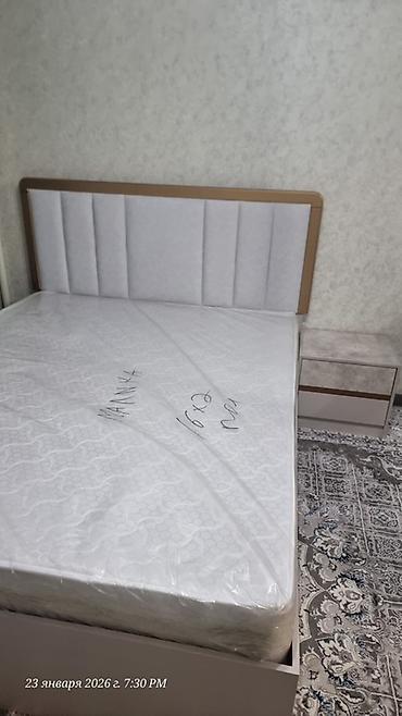 - Кровать с мягким изголовьем панельного типа (вертикальная прострочка), основание под матрас 160×200 см (на матрасе пометка 6). Низкий короб, спокойный светло‑серый тон с акцентными вставками под дерево.