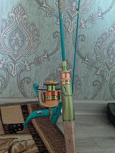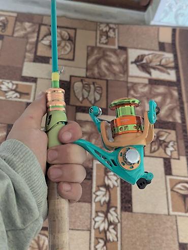 - Двухсекционное спиннинговое удилище (бирюзовый бланк) с пропускными кольцами и корковой рукоятью.