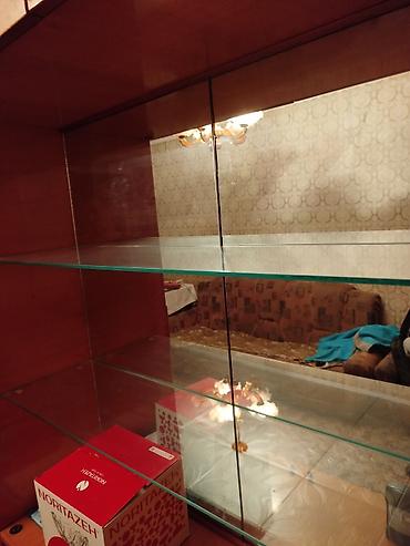 - Зеркальный сервант с раздвижными стеклянными дверцами и стеклянными полками для посуды и декора.