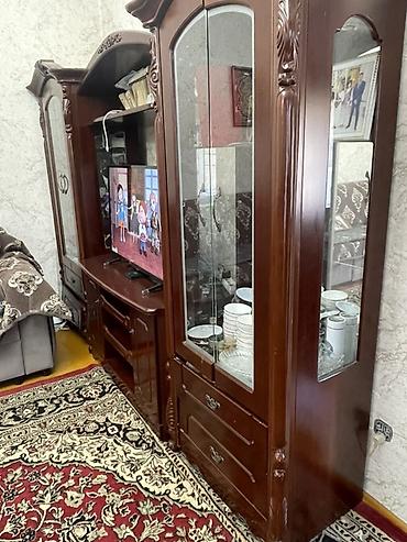 - Две витрины по бокам с прозрачными стеклянными дверцами и боковыми стеклянными вставками — удобно для посуды, сервизов, коллекций.