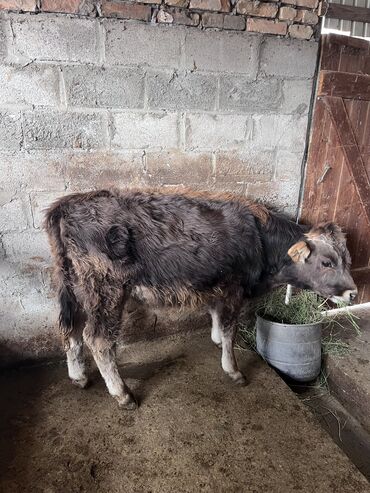 Бычок (молодняк КРС), рогатый, содержится на привязи в стойловых условиях. Окрас буро‑коричневый с более светлой головой и белыми отметинами на морде и ногах. Корпус широкий, крепкий костяк, хорошо...