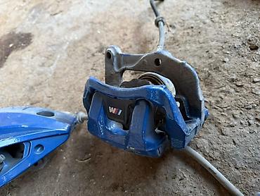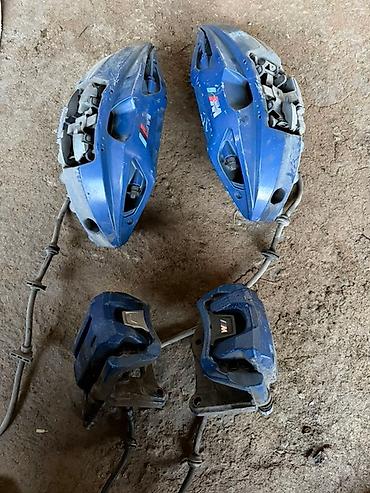 - Задние однопоршневые суппорты M (синие, с логотипом M), пара, с кронштейнами и шлангами.
