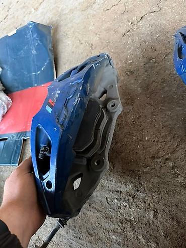 - Передние 4‑поршневые суппорты M (синие, с логотипом M), пара, с тормозными шлангами.