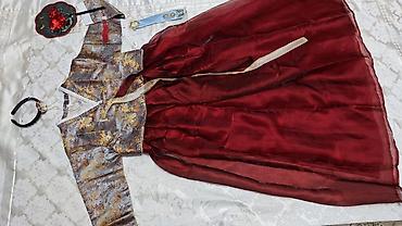 - Комплект: длинная расклешённая юбка-чи́ма бордового цвета и жакет-чо́годори/чо́гори с контрастными рукавами и светлой планкой застёжки спереди.