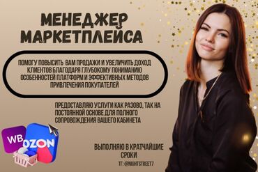 Услуги менеджера маркетплейсов Профессиональное ведение аккаунтов и развитие продаж на маркетплейсах. Выпускница лицея №17 (Бишкек). Опыт: с 2016 по 2025 — селлер; менеджер маркетплейсов. Что дел...