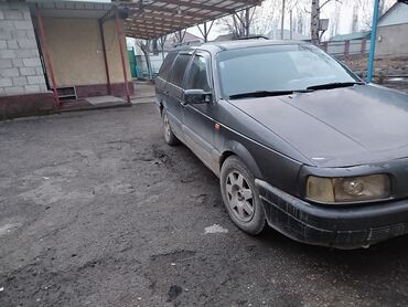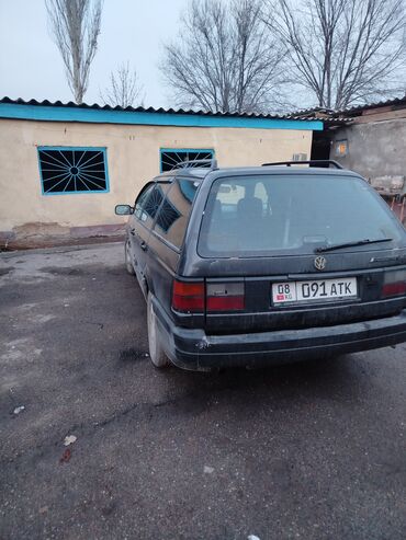 Автомобиль Volkswagen Passat B3 Variant с кузовом универсал. Автомобиль оснащен рейлингами на крыше и люком. Цвет кузова - темный, предположительно темно-серый или черный. На автомобиле установлены стандартные легкосплавные диски. Задние фонари и передние фары соответствуют модели Passat B3. Автомобиль имеет государственные регистрационные номера Кыргызстана.