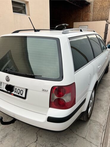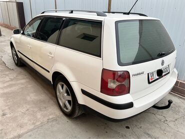 Volkswagen Passat Variant (универсал), белый цвет. Двигатель 2.0 (указание на крышке багажника). Кузов универсал с продольными рейлингами на крыше. Европейская оптика, передние противотуманные фары. Литые диски Volkswagen, всесезонные шины. Задняя часть оснащена фаркопом. Тонированные задние стекла, черные защитные молдинги по периметру, оригинальная решетка радиатора с эмблемой VW.