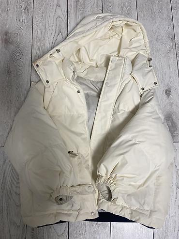 Женское утеплённое пальто-пуховик. - Длина: ниже колена (mid-length), прямой свободный крой. - Цвет: светло-бежевый; внутренняя подкладка тёмная. - Утепление: стёганые горизонтальные секции для ра...