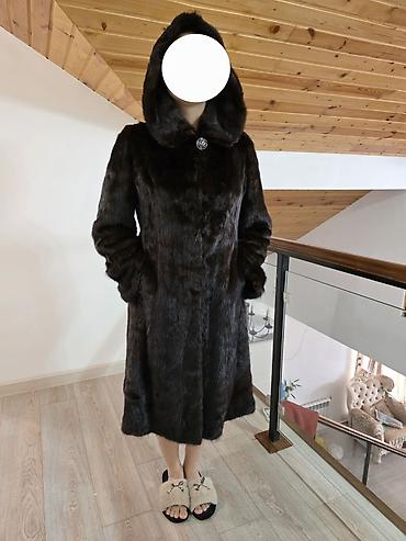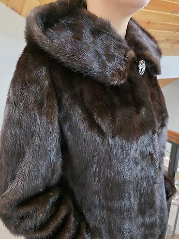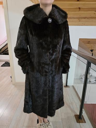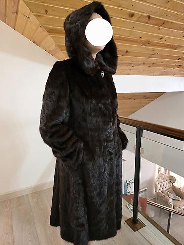 Шуба из натуральной норки, насыщенный темно‑шоколадный цвет. Классический А‑силуэт длины миди с капюшоном.