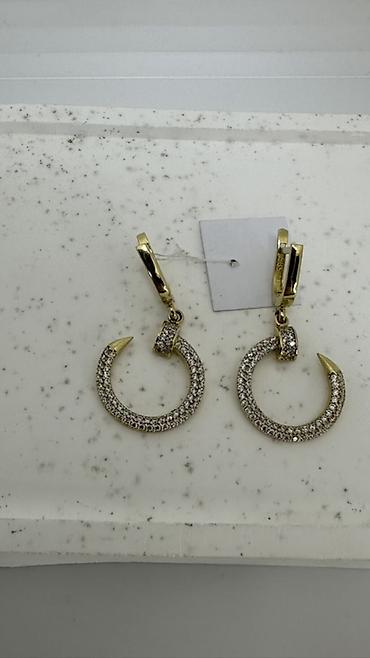 - Серьги-подвески «Клык/полумесяц»: круглые подвесы с заострённым концом, полностью усыпанные прозрачными камнями. Верхняя петля подвеса также инкрустирована. Основа — жёлтый металл с полированным блеском, крепление на английскую застёжку.