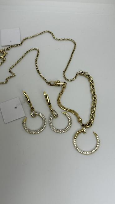 - Комплект: серьги «Клык/полумесяц» и сочетающаяся подвеска-кулачок/полумесяц на цепочке жёлтого цвета. Цепь с продолговатой застёжкой-карабином и дополнительным звеном-браслетом/удлинителем.