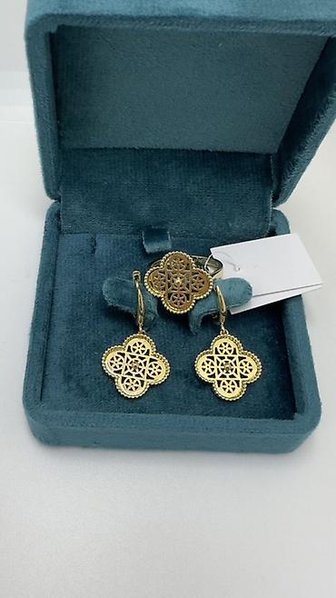- Ажурный «квадрифолий»: серьги-подвески и кольцо с резным геометрическим орнаментом, по краю — деликатный зерненный кант. Лаконичные английские замки, гладкая полированная основа.