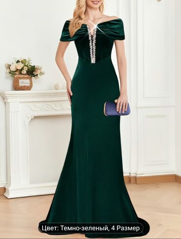 1) Длинное бархатное платье в пол, цвет: темно‑зелёный, размер: 4. Открытые плечи, мягкая драпировка лифа, глубокий V‑вырез с декоративной вертикальной вставкой из сияющих элементов. Плотный бархат, плавно расширяющийся к низу силуэт «русалка».