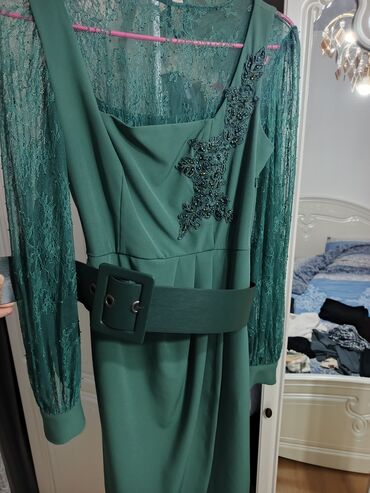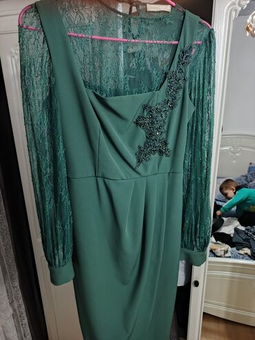 Элегантное вечернее платье изумрудного цвета.42,44размер Основные детали: - Длина миди/макси, прямой силуэт. - Верх с драпировкой по лифу, создающей мягкие складки. - Полупрозрачные длинные рукава...