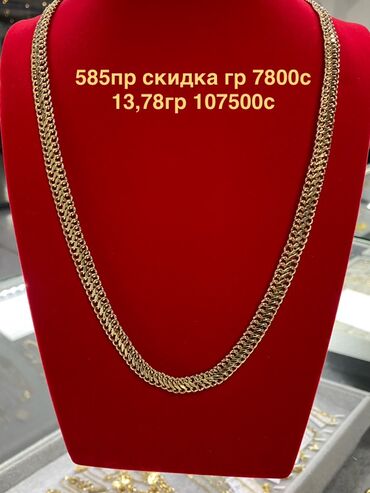 Золотые цепи 585 пробы Варианты из красного золота с бирками и пробой 585: - Цепь, масса 19,24 г. Дизайн: продолговатые звенья с декоративными перемычками. Цена 145000 сом. - Цепь, масса 18,99 г. ...