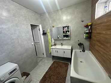 - Большая ванная комната: полноценная ванна, две раковины в тумбе, зеркало‑шкаф, место под стиральную машину, отделка плиткой, часть стены под дерево, дополнительное окно для естественного света.