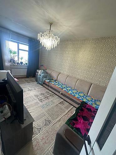 - Гостиная с большим окном, радиатором отопления, люстрой и декоративными обоями; достаточно места для ТВ-зоны.