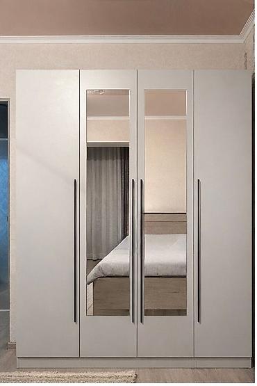 Шкаф-купе/распашной 4-дверный, цвет светло-серый, с двумя зеркальными фасадами по центру. Современный минималистичный дизайн с длинными вертикальными ручками темного цвета.