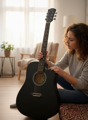 - Классический корпус дредноут с вырезом (cutaway) для удобного доступа к верхним ладам.