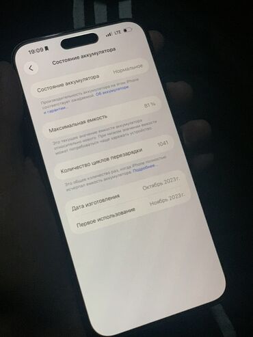 - Дисплей с вырезом Dynamic Island, работает, сенсор и подсветка в норме (на фото — экран блокировки и раздел «Состояние аккумулятора»).