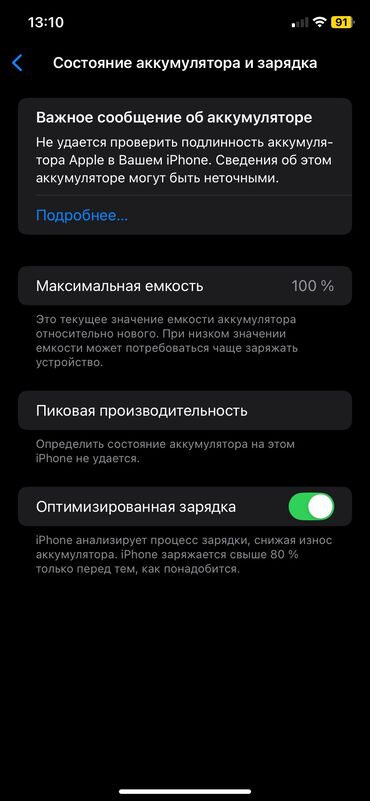 - Аккумулятор: отображается сообщение «Не удаётся проверить подлинность аккумулятора Apple», максимальная ёмкость в настройках — 100%, включена «Оптимизированная зарядка», «Пиковая производительность: определить состояние не удаётся»