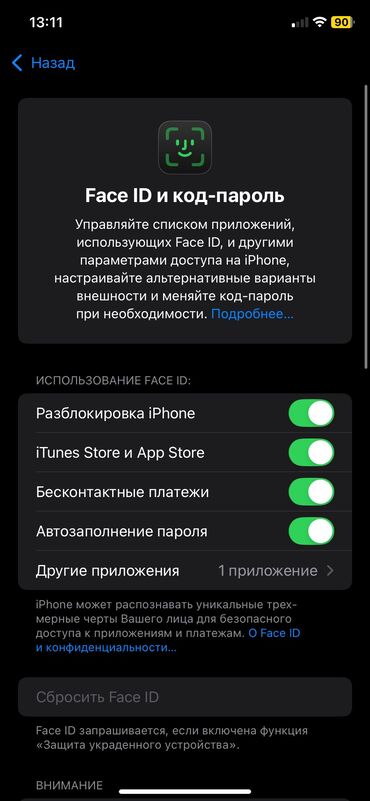 - Face ID работает: разблокировка iPhone, iTunes Store и App Store, бесконтактные платежи, автозаполнение пароля, доступ в других приложениях