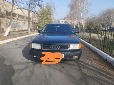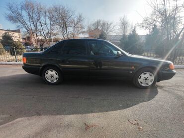Audi 100 C4 седан, тёмно‑зелёный цвет. Классический дизайн с фирменной решёткой и эмблемой Audi, прямоугольная оптика, противотуманные фары в переднем бампере. Оригинальные легкосплавные диски Audi, тонированные стёкла.